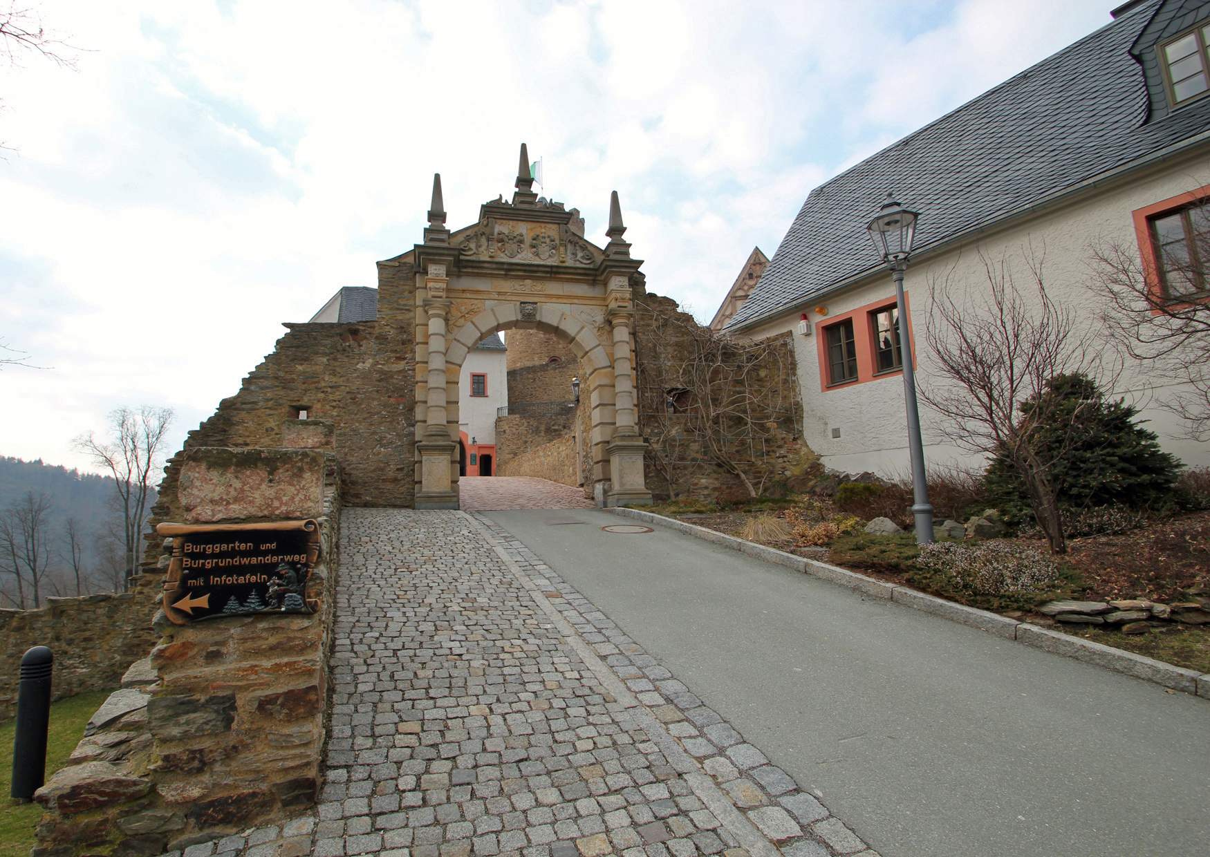 Sehenswürdigkeit Burg Scharfenstein im Erzgebirge Bild zum vergößern anklicken Nächstes Bild Vorheriges Bild Das Tor an der Brücke zur Burg Scharfenstein. Im Vordergrund links geht es zum Burggarten Scharfenstein und zum Burgrundwanderweg mit Informationstafeln. (03/2011)