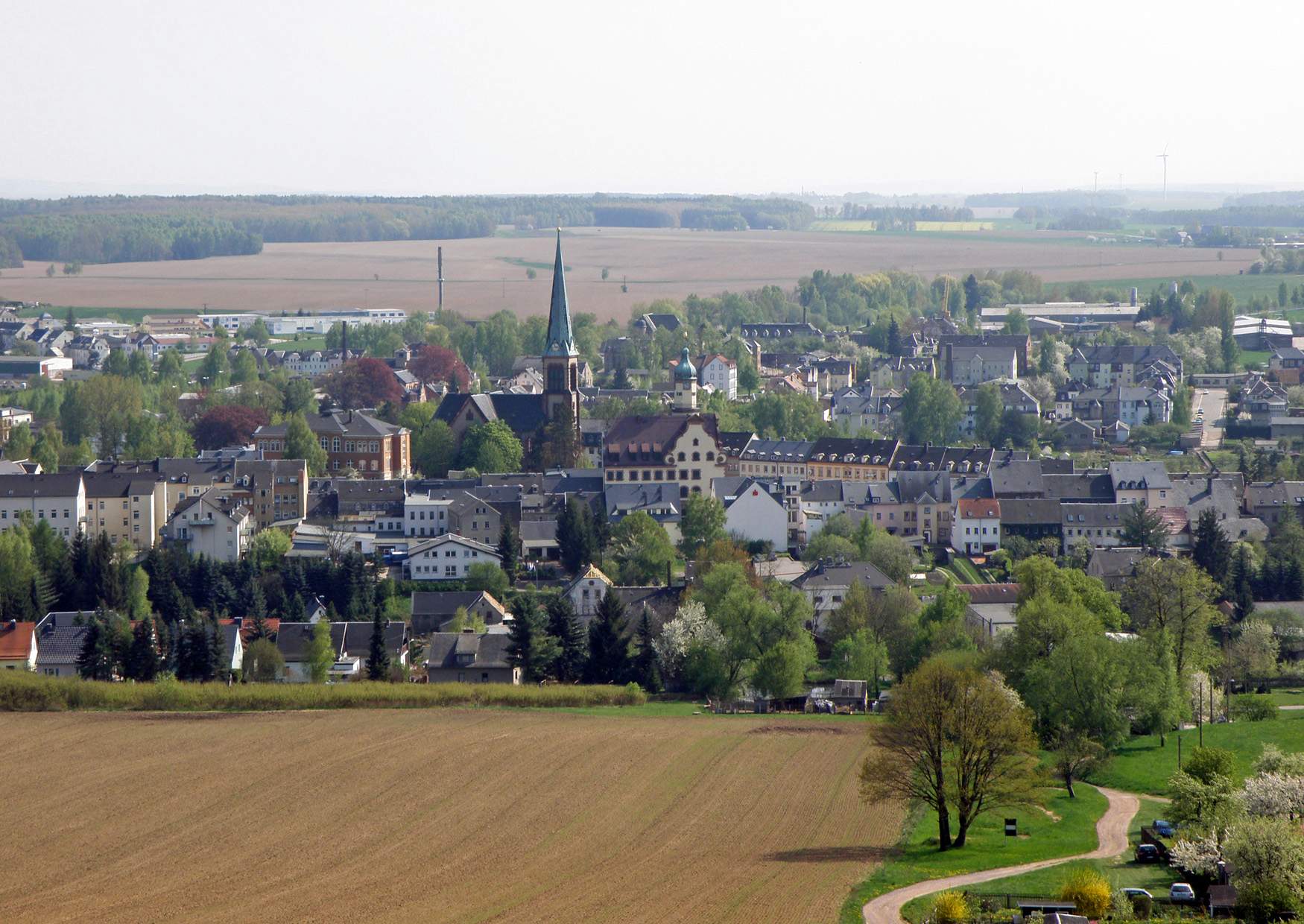 Der Blick vom Aussichtsturm auf das Zentrum von Geringswalde Bild zum vergößern anklicken Nächstes Bild Vorheriges Bild Der Blick vom Turm auf das Stadtzentrum von Geringswalde mit der Martin Luther Kirche und rechts daneben der Turm vom Rathaus.
