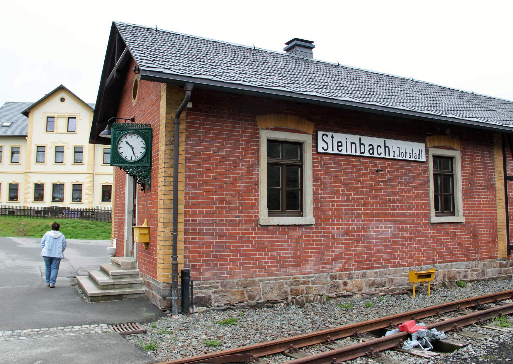 Der Tagesausflug mit der Wanderung durch das Schwarzwasser- und Preßnitztal beginnt auf dem Bahnhof Steinbach der Preßnitztalbahn, einer Schmalspurbahn im Erzgebirge. Ich finde vor allem die nostalgischen Bahnhofsuhren der Preßnitztalbahn schön.